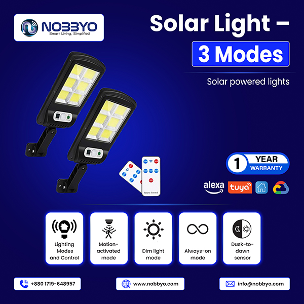 NOBBYO Solar Light – 3 Modes একটি স্মার্ট ও পরিবেশবান্ধব আলো সমাধান, যা সম্পূর্ণভাবে সৌর শক্তিতে পরিচালিত এবং কোনও তার বা বিদ্যুৎ সংযোগ ছাড়াই আপনার বাড়ি, বাগান বা খামারকে আলোকিত রাখবে।